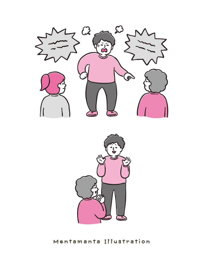 怒る人とそれを微妙な表情で眺める人たち、謝る人と許す人などを描きました。