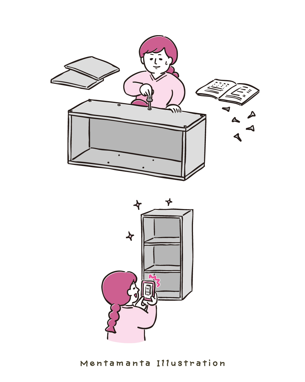 棚を自分で組み立てる人と、完成した棚を写真に撮る様子を描きました。