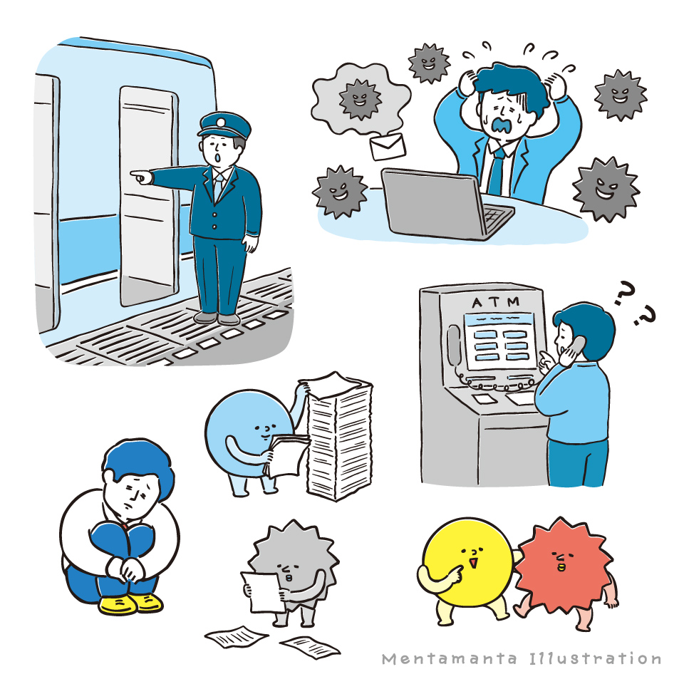 本文カットでは「業務用パソコンをウイルス感染させてしまった人」「海外送金がうまくできず困っている人」「指差し確認する駅員さん」などのシーンイラストも描いています。