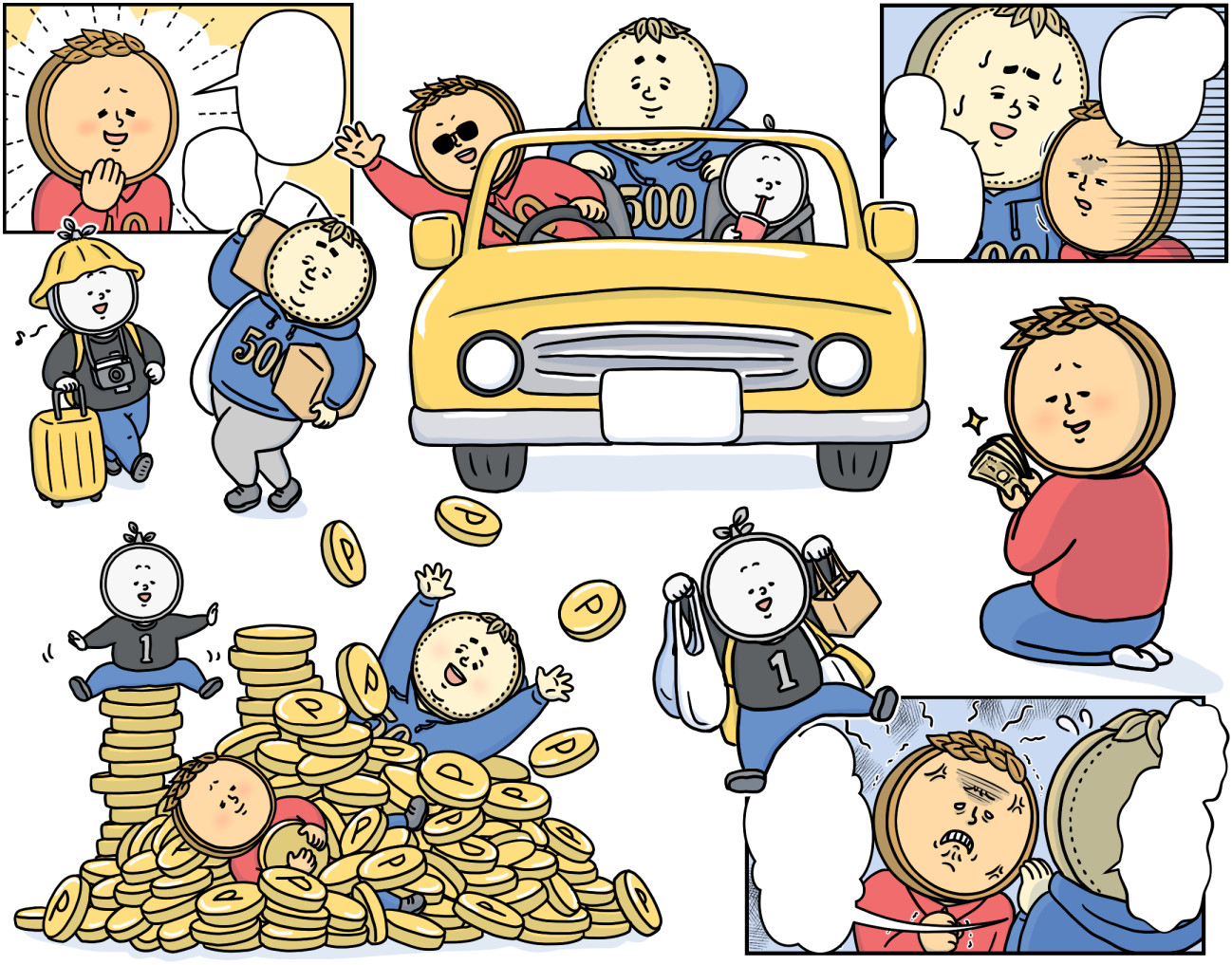 赤い服の主人公は10円玉、青い服の大きな人は500円玉、黒い服の小柄な人は1円玉がモチーフになっています。
